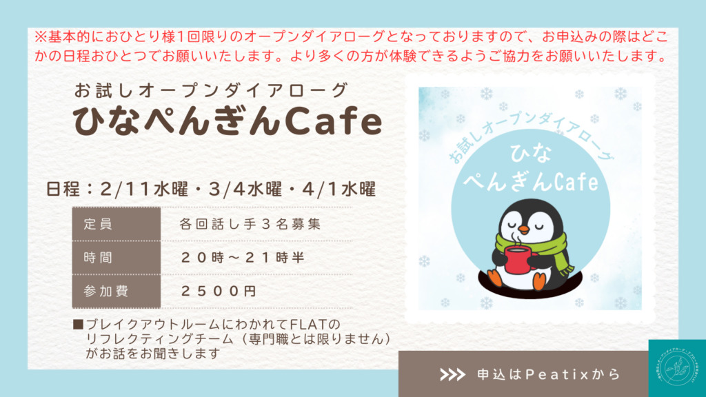 お試しオープンダイアローグ「ひなぺんぎんCafe」では、話し手を募集しております。
