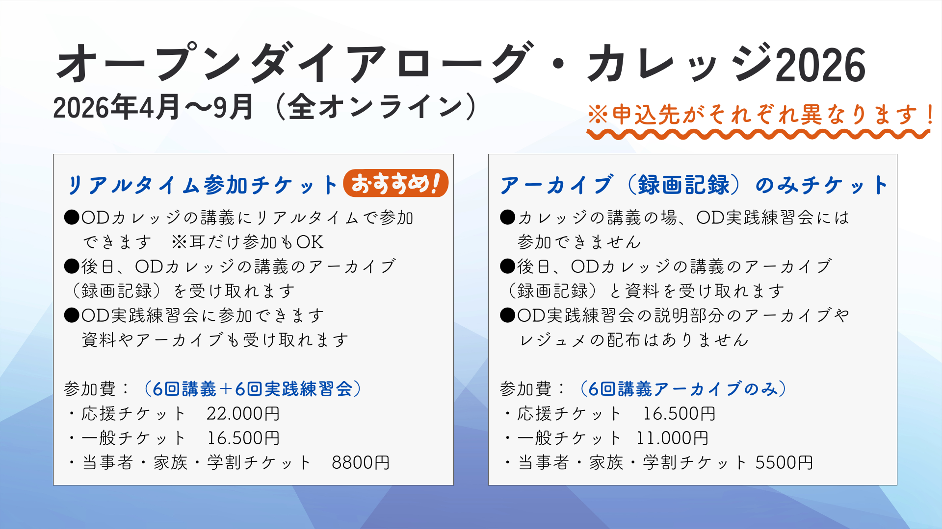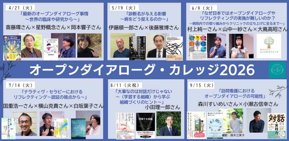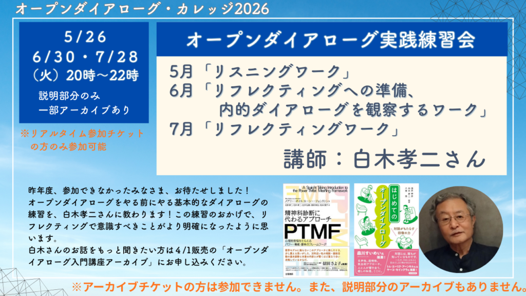 はじめてオープンダイアローグを学ぶ方へ:カレッジの中では、オープンダイアローグの基礎知識についての講座は設けておりませんが、はじめて学ばれる方向けの本や動画については、メール等の案内の中で紹介いたします。また、2025年10月~2026年3月にかけて開催した白木孝二さんによる「オープンダイアローグ入門講座:基礎知識編」のアーカイブ販売も致しますので、よかったらご購入をご検討ください。