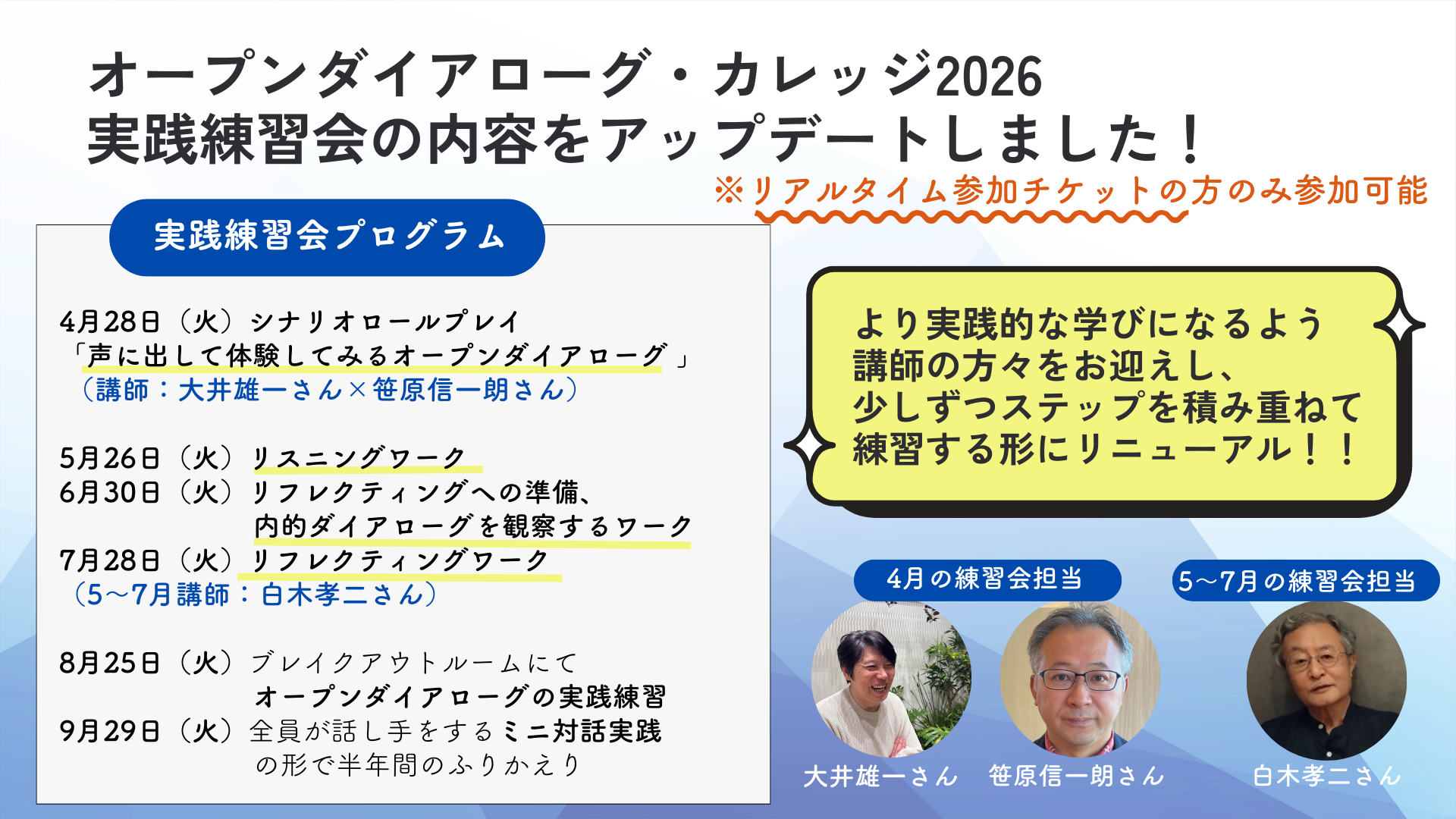 また、リアルタイム参加チケットにお申込みいただくと、ひとりではなかなか練習できないオープンダイアローグを、みんなで練習する「実践練習会」にも参加できます。