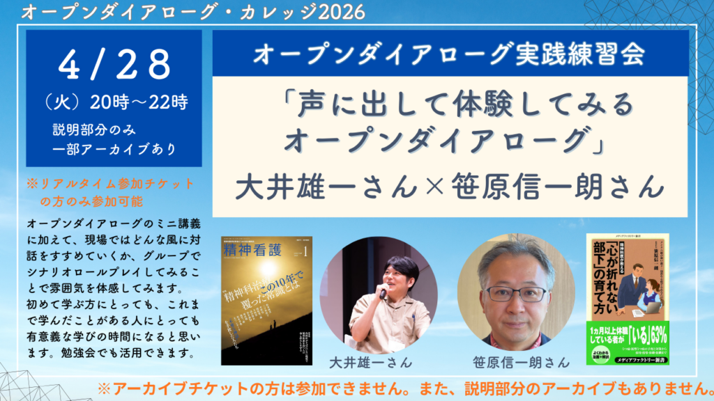 4月は大井雄一さん、笹原信一朗さんを講師に「声に出して体験してみるオープンダイアローグ」というシナリオロールプレイを体験します。初めて学ぶ方にとってもオープンダイアローグの雰囲気がつかめるものになると思います。